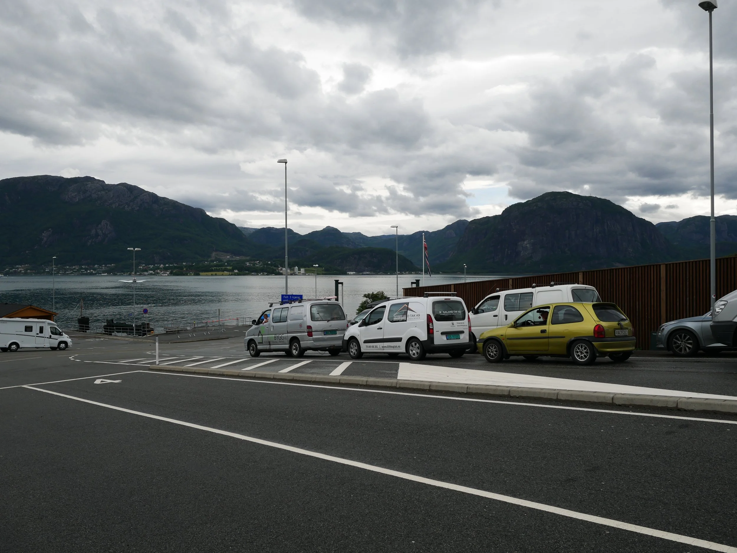 Der Platz liegt in Sauda, etwas abseits der üblichen Touristenrouten direkt an einem Fjord. Ein seltsamer Anblick, da auf den umliegenden Bergen noch Schnee lag.