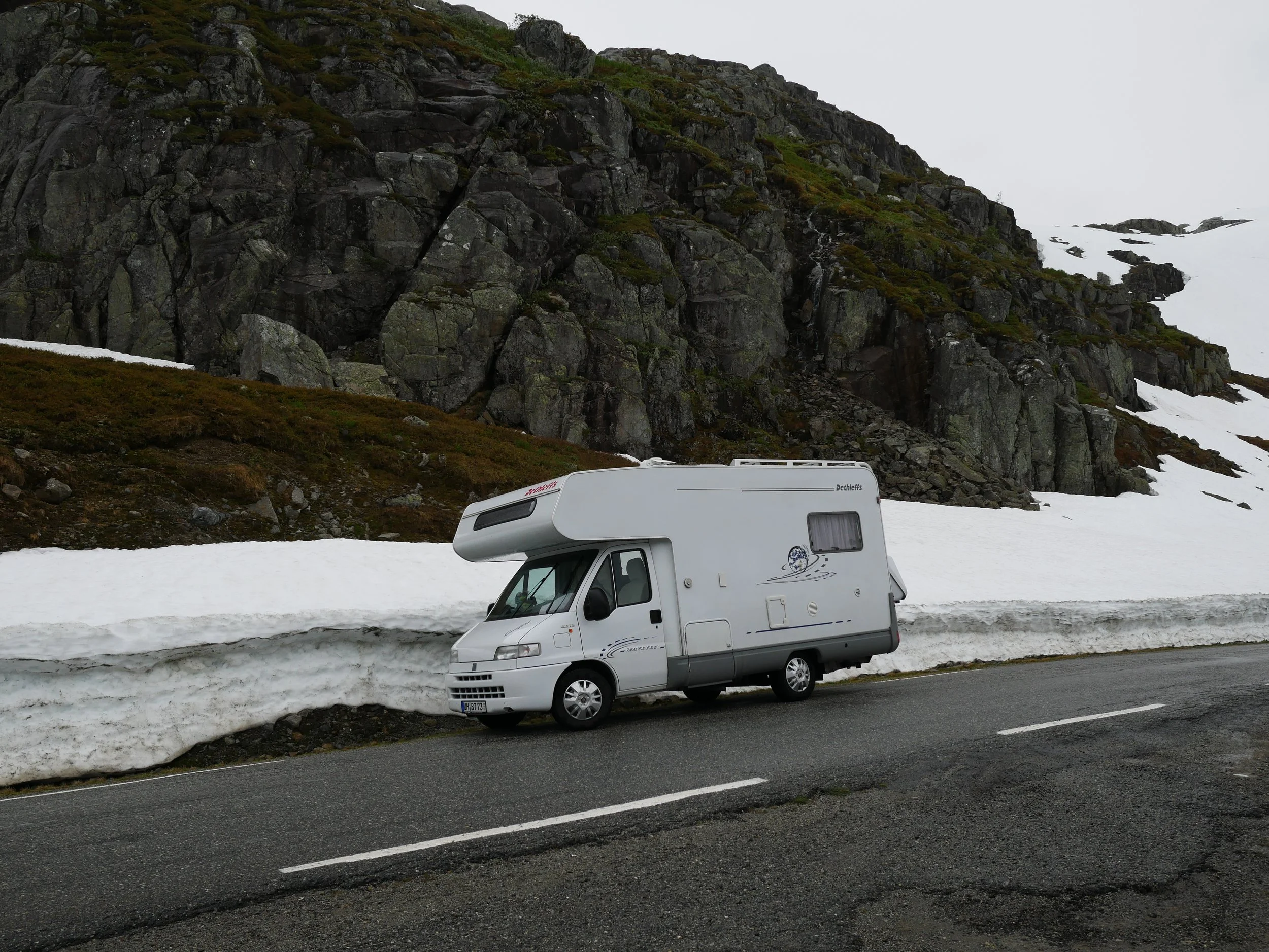 Entlang der Straße gab es auch noch eine Menge Schnee. Er lag teilweise so hoch wie unser Wohnmobil ist (3m+). Der Schnee war so zu sagen die Wand, welche scheinbar von großen Fräsen durch den norwegischen Straßendienst passierbar gemacht wurden war.